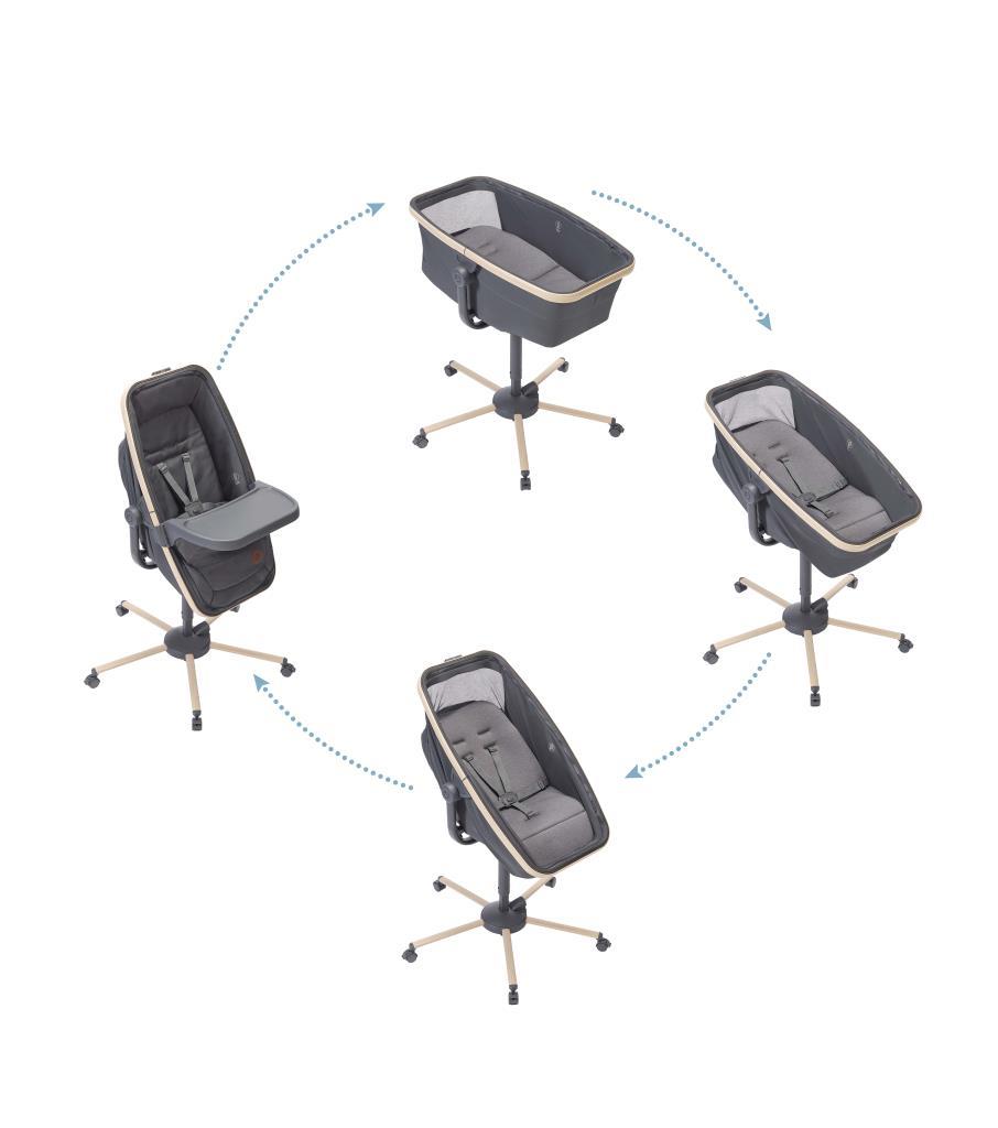 Birbirine yakın dururken bebeğinizin gün boyu tüm ihtiyaçlarına cevap verecek şekilde tasarlanmış şık hepsi bir arada beşik, uzanma koltuğu ve mama sandalyesi.