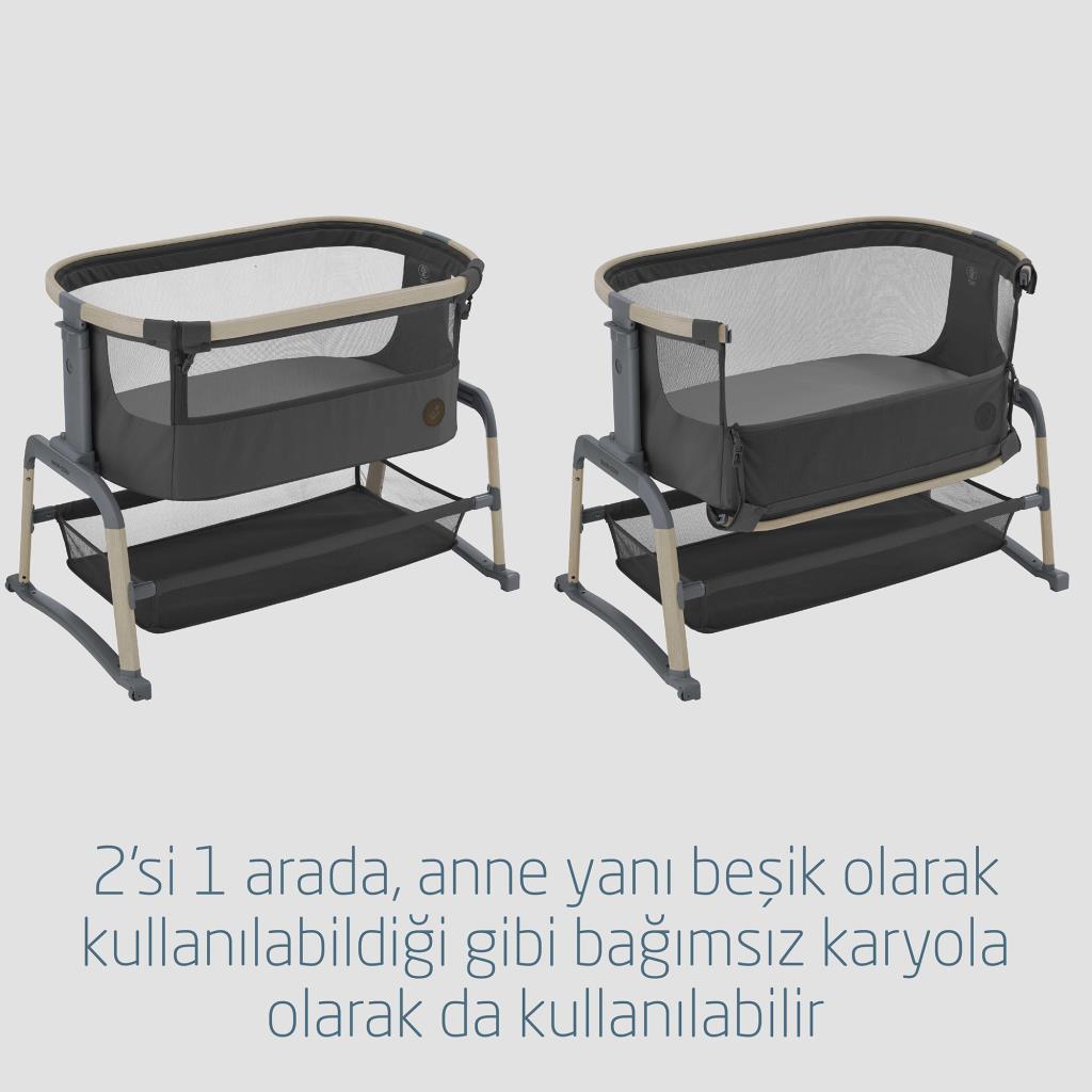 2’si 1 arada anne yanı beşik olarak kullanılabildiği gibi bağımsız karyola olarak da kullanılabilir