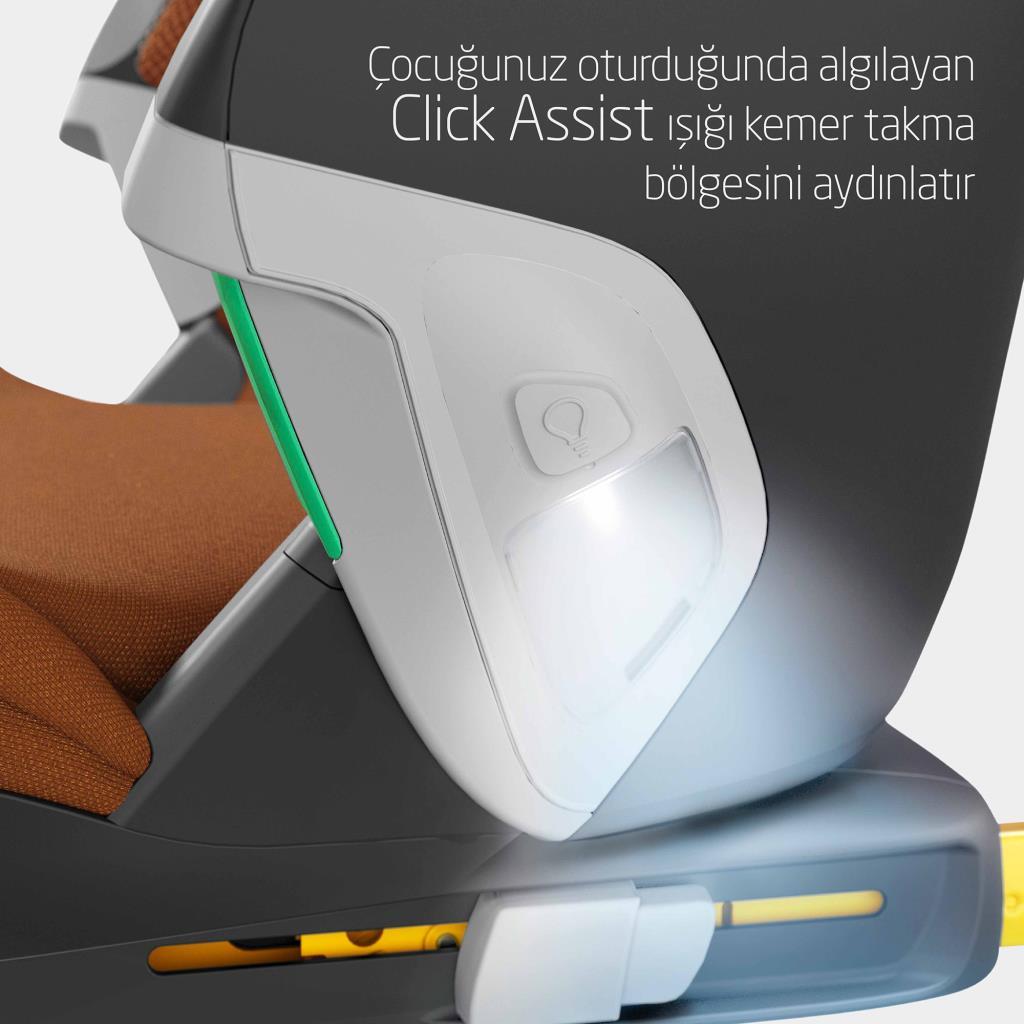 i-Size uyumlu Maxi-Cosi Kore PRO i-Size Çocuk Oto Koltuğu, çocuğunuzun herhangi bir yardım almadan kemerini bağlamasını sağlar. Emniyet kemeri bağlantı tokasını daha da görünür kılmak için benzersiz bir aydınlatma sistemi olan ClickAssist ışığına sahiptir! Böylece çocuğunuz ilk kurulumdan sonra hemen kendi kendine kemerini takabilir.