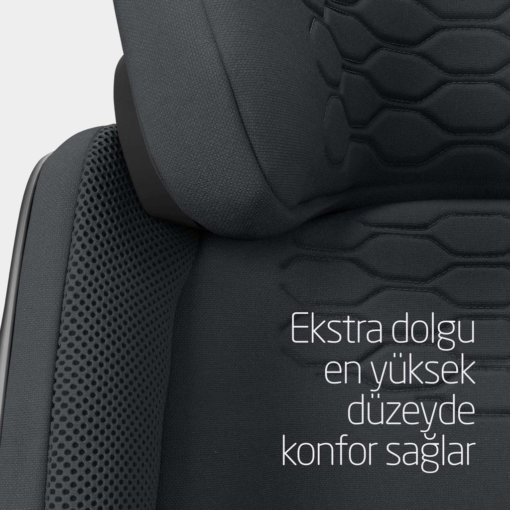 Maxi-Cosi Kore PRO i-Size Çocuk Oto Koltuğunun nefes alabilir koltuk kılıfı sırtta ve koltuk başlığında kalın ve yumuşak bir dolguya sahiptir, bu da uzun yolculuklarda yüksek düzeyde konfor sağlar.