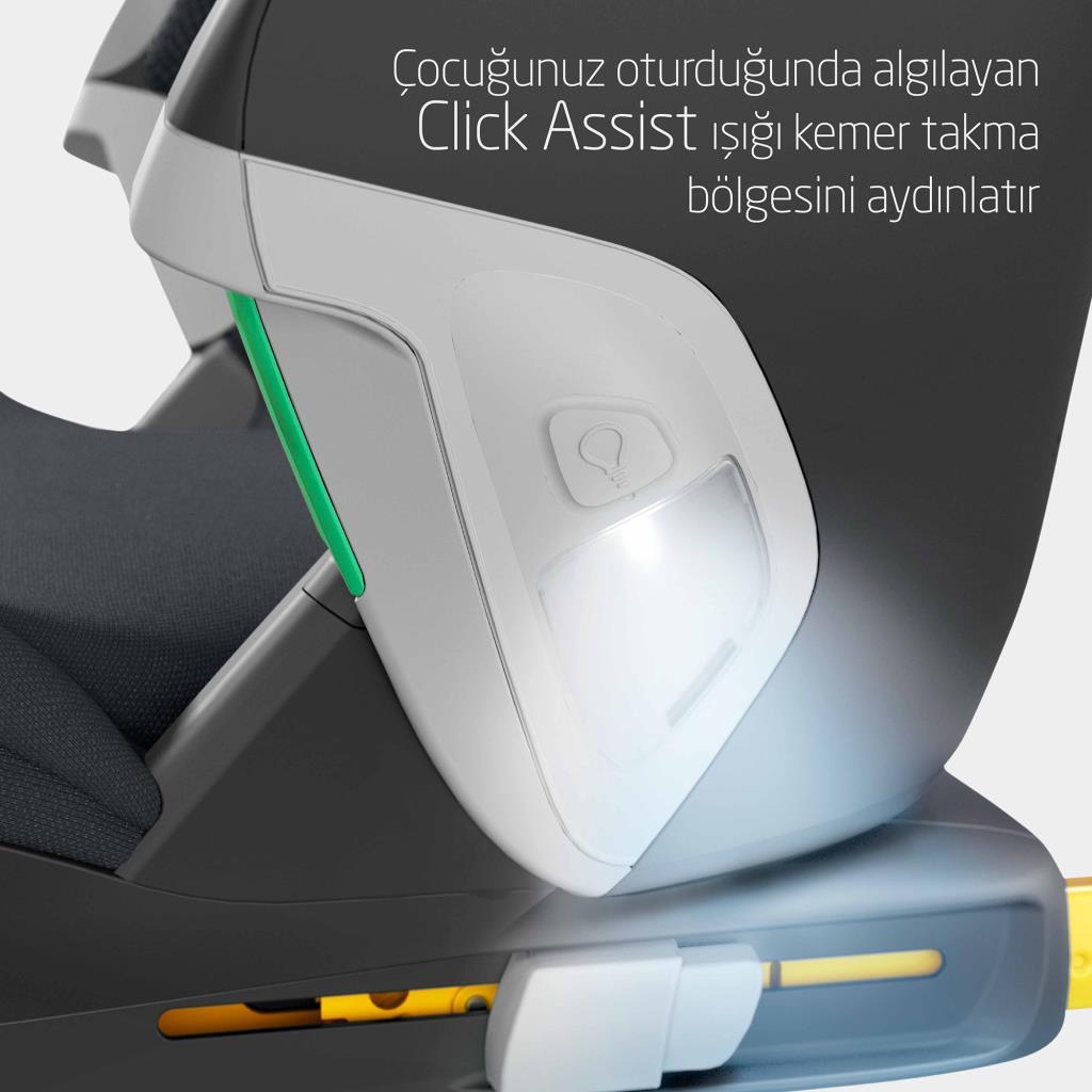 i-Size uyumlu Maxi-Cosi Kore PRO i-Size Çocuk Oto Koltuğu, çocuğunuzun herhangi bir yardım almadan kemerini bağlamasını sağlar. Emniyet kemeri bağlantı tokasını daha da görünür kılmak için benzersiz bir aydınlatma sistemi olan ClickAssist ışığına sahiptir! Böylece çocuğunuz ilk kurulumdan sonra hemen kendi kendine kemerini takabilir.