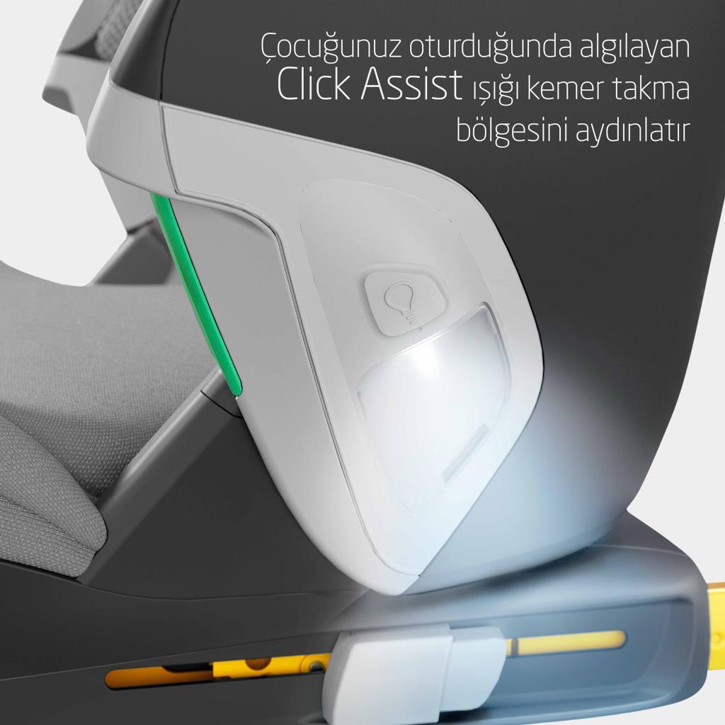 i-Size uyumlu Maxi-Cosi Kore PRO i-Size Çocuk Oto Koltuğu, çocuğunuzun herhangi bir yardım almadan kemerini bağlamasını sağlar. Emniyet kemeri bağlantı tokasını daha da görünür kılmak için benzersiz bir aydınlatma sistemi olan ClickAssist ışığına sahiptir! Böylece çocuğunuz ilk kurulumdan sonra hemen kendi kendine kemerini takabilir.