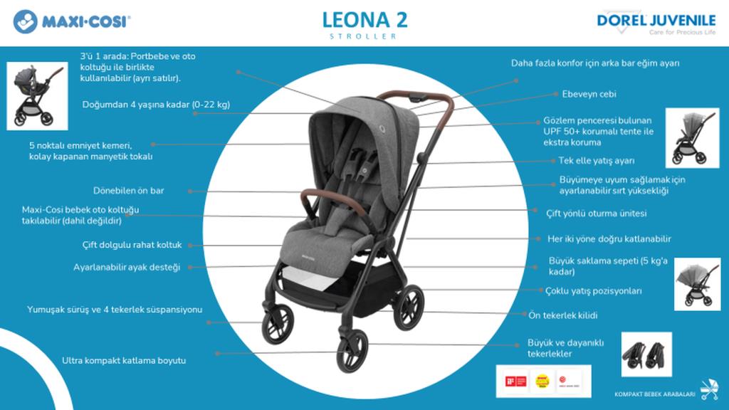 Leona bebek arabası, maksimum konforu ultra kompakt bir boyuta sığdırır. Süper hafif, küçük alanlara, taksi bagajlarına sığar ve şehir yaşamını kolaylaştırır.