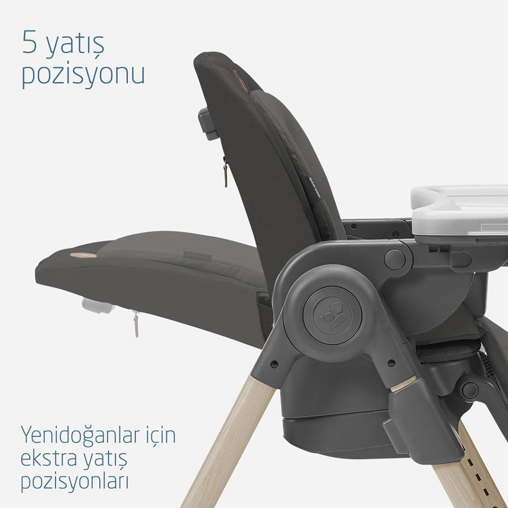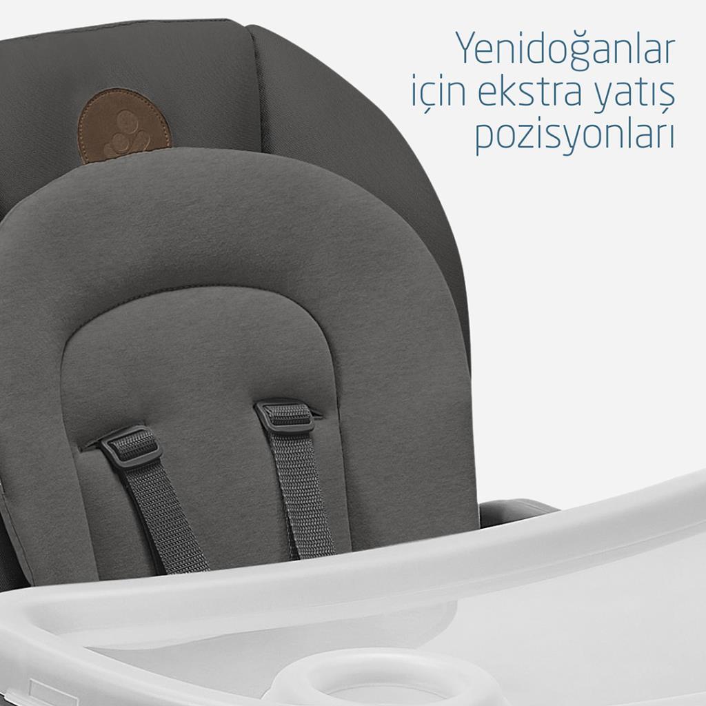 Yeni doğan bebekler için 5 yatış poziyonu, 4 farklı tepsi pozisyonu, 9 farklı yükselik ayarı ile, mama sandalyesi, masa yanı sandalyesi ve booster olarak kullanılabilirsiniz.