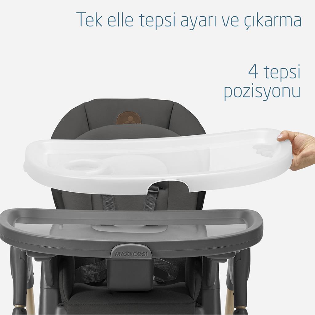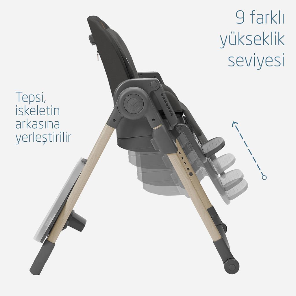 Farklı tepsi yüksekliği ile ayarlanabilir mama sandalyesi fonksiyonu ile hem bebeğinizin ve çocuğunuzun, hem de sizin boyunaza ve konforunuza göre tepsi ayarı yapabilirsiniz.