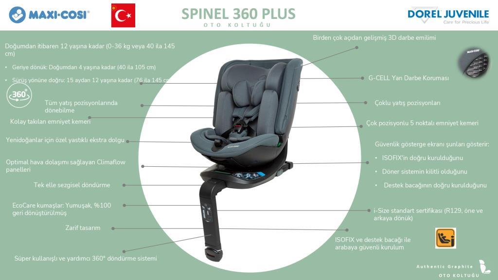 Maxi-Cosi Spinel 360 Plus, doğumdan yaklaşık 12 yaşına kadar 360° dönebilen koltuğun rahatlığına sahip bir bebek ve çocuk oto koltuğudur.