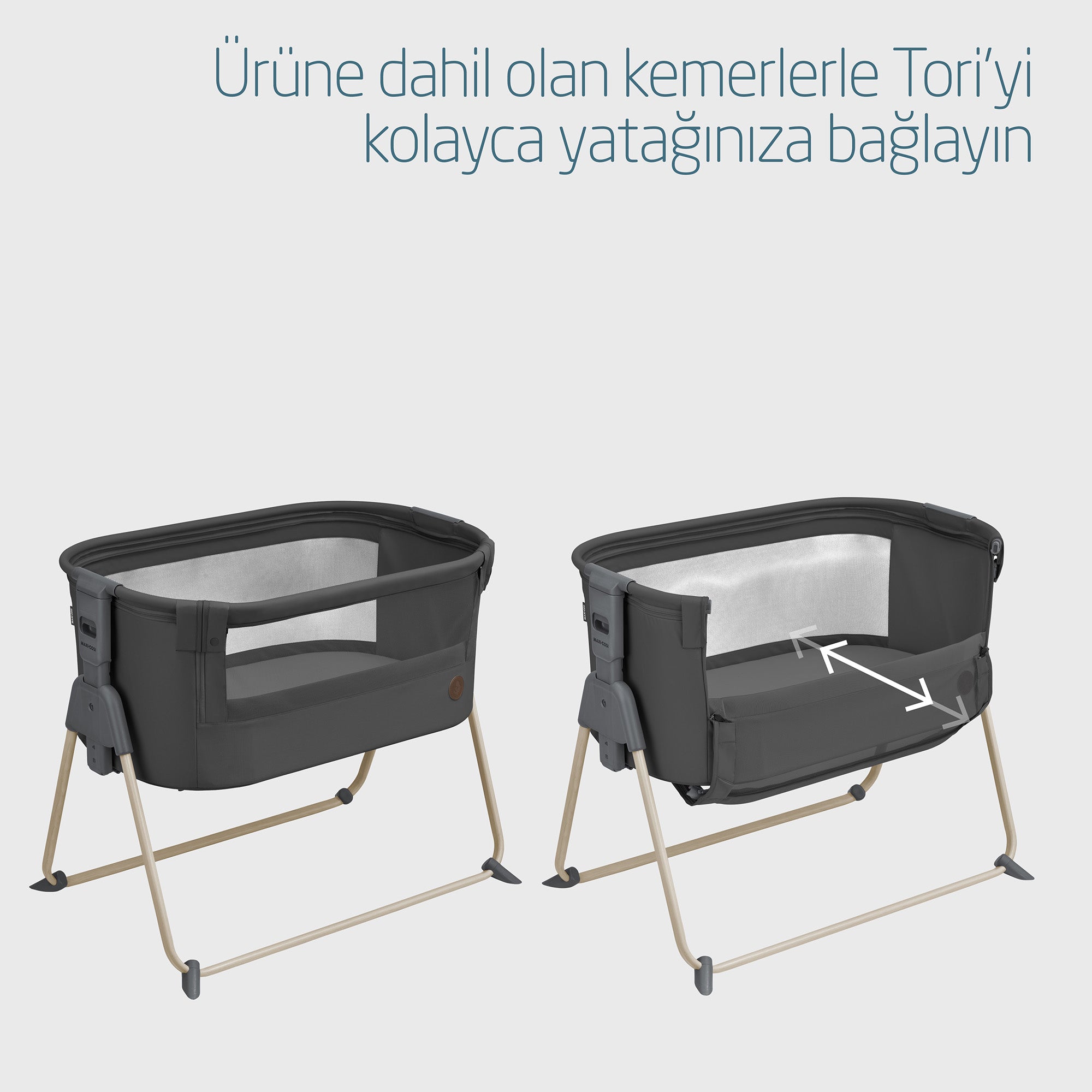 Kompakt ve rahat. Yumuşak, destekleyici ekstra konforlu yatağıyla bebeğiniz Tori yan yatağında yanınızda, her zaman rahatça uyuyacak.