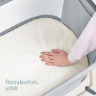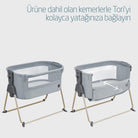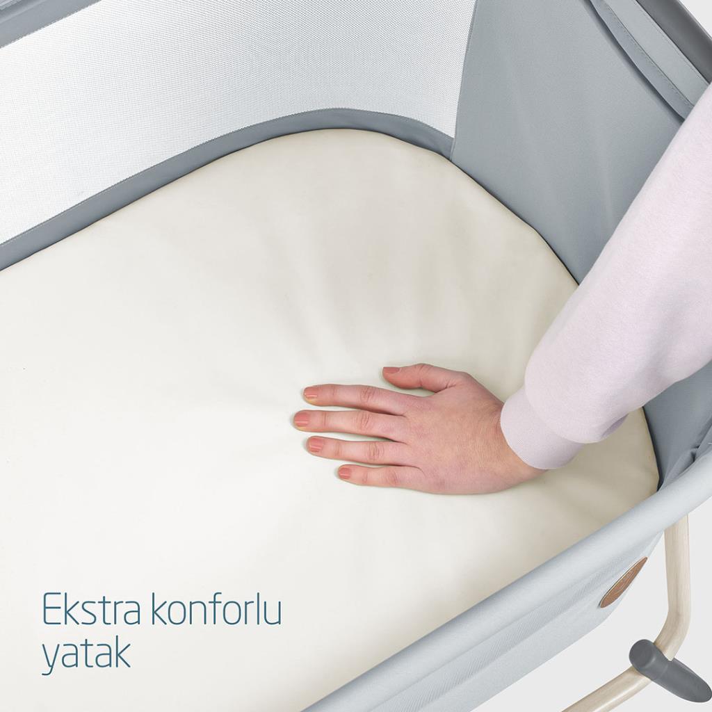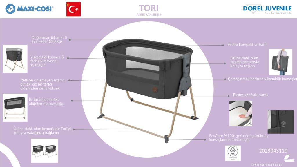 Kompakt ve rahat. Yumuşak, destekleyici ekstra konforlu yatağıyla bebeğiniz Tori yan yatağında yanınızda, her zaman rahatça uyuyacak.